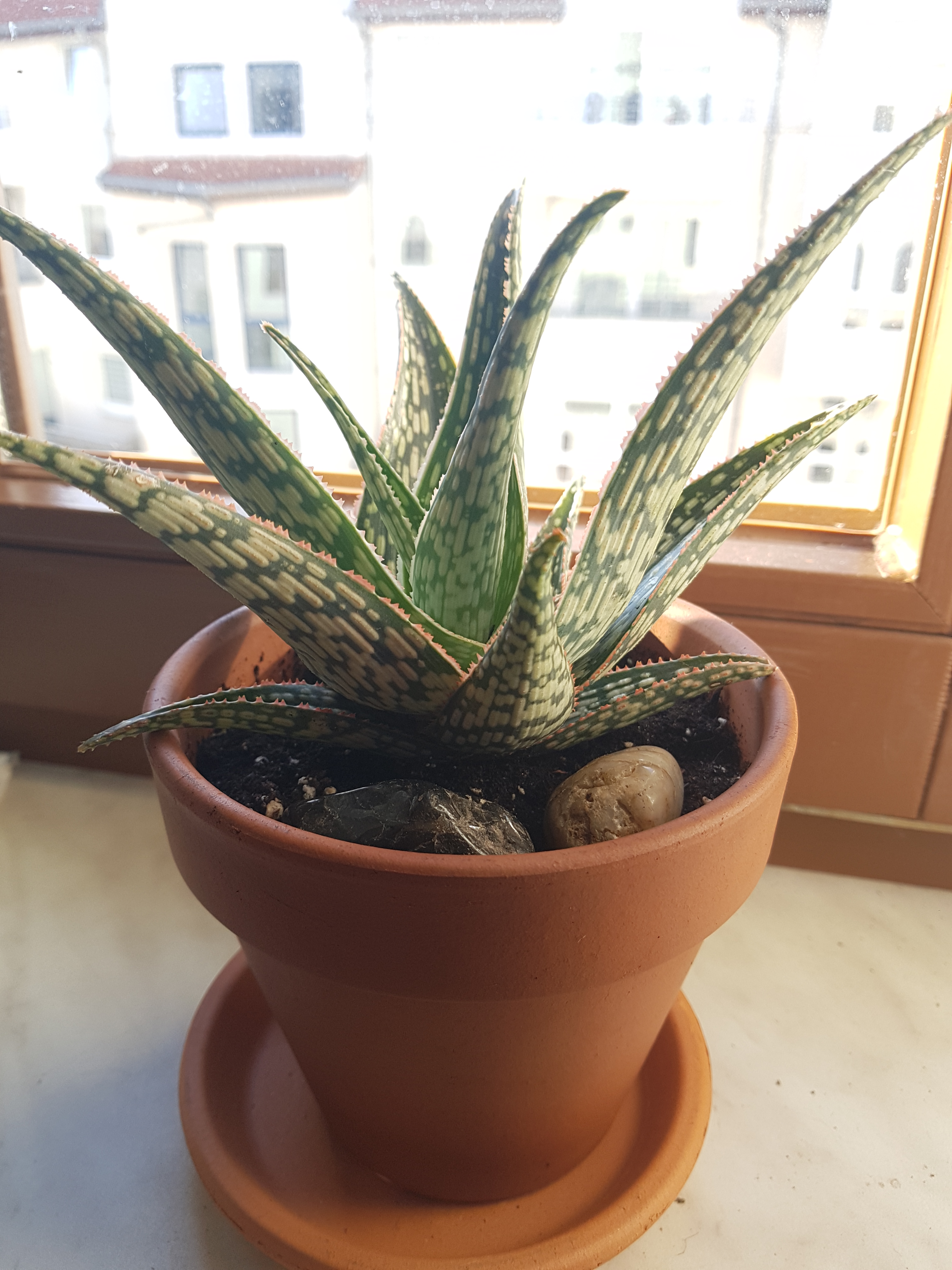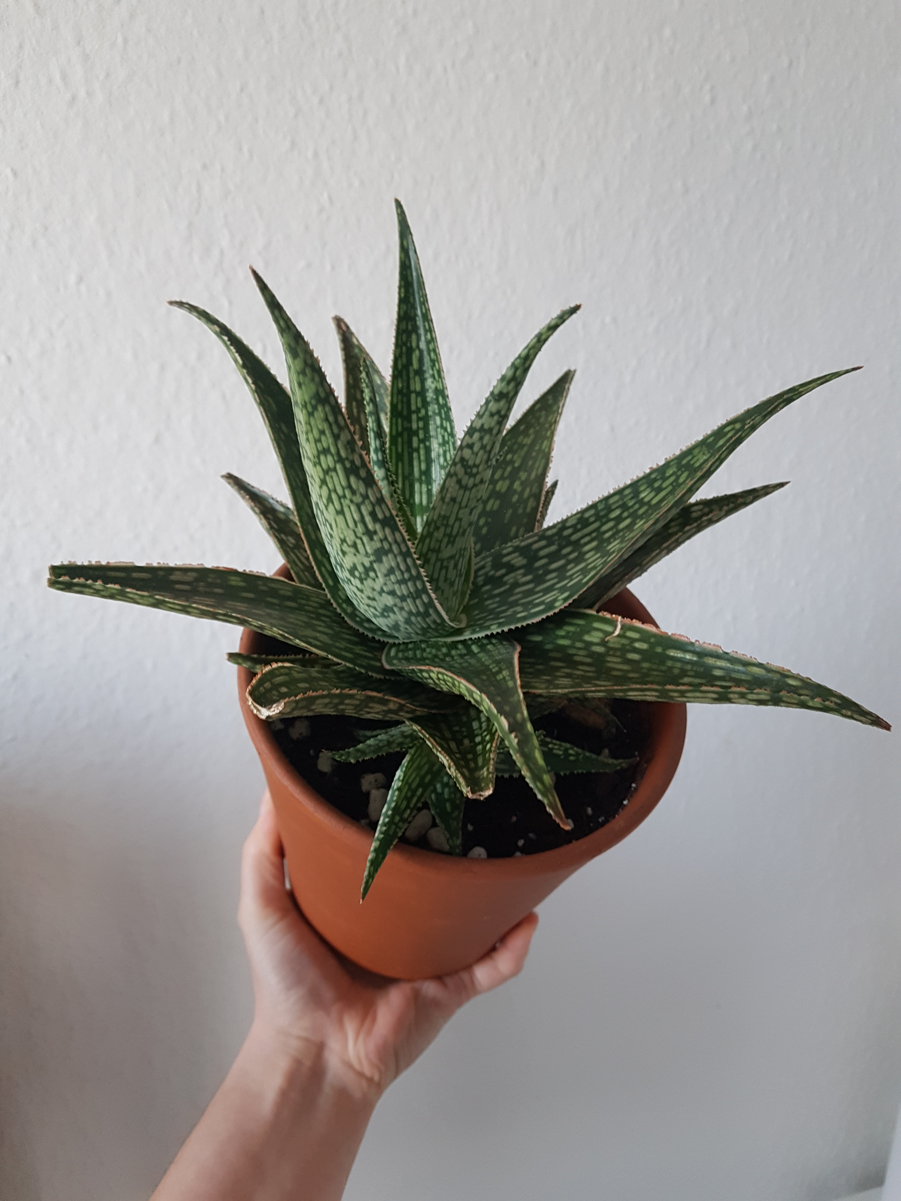I got this aloe from the supermarket, so I have no idea what species it is, but it is some kind of hybrid aloe and absolutely gorgeous. She has also bloomed twice! for me since I got her (whereas the typical aloe veras are rather hard to get to bloom, I believe). Unfortunately I broke off a few of her tips when moving, but she’s thanked me by giving me two pups, so I believe I’m forgiven. My verdict in short: gorgeous succulent – in long: