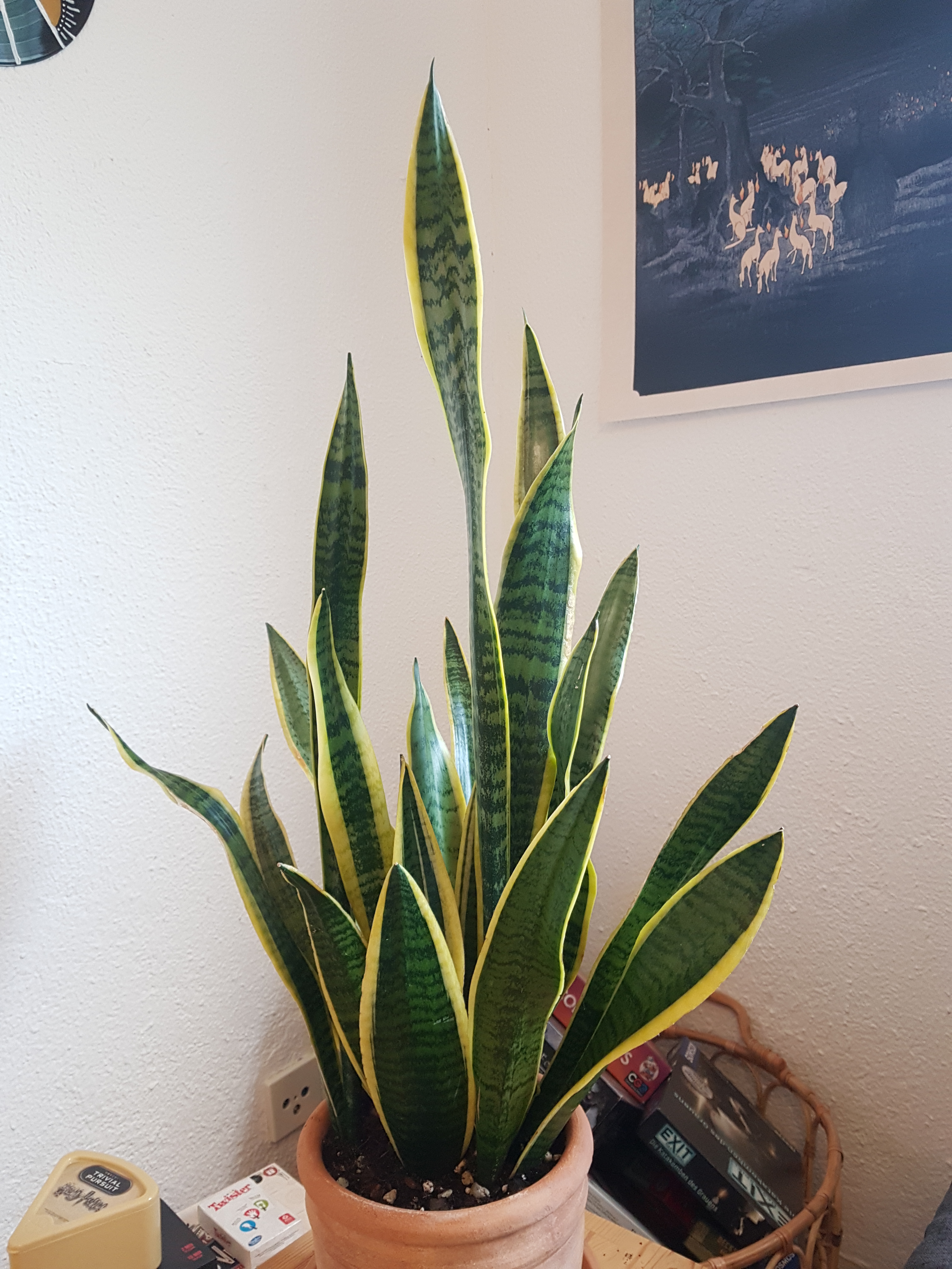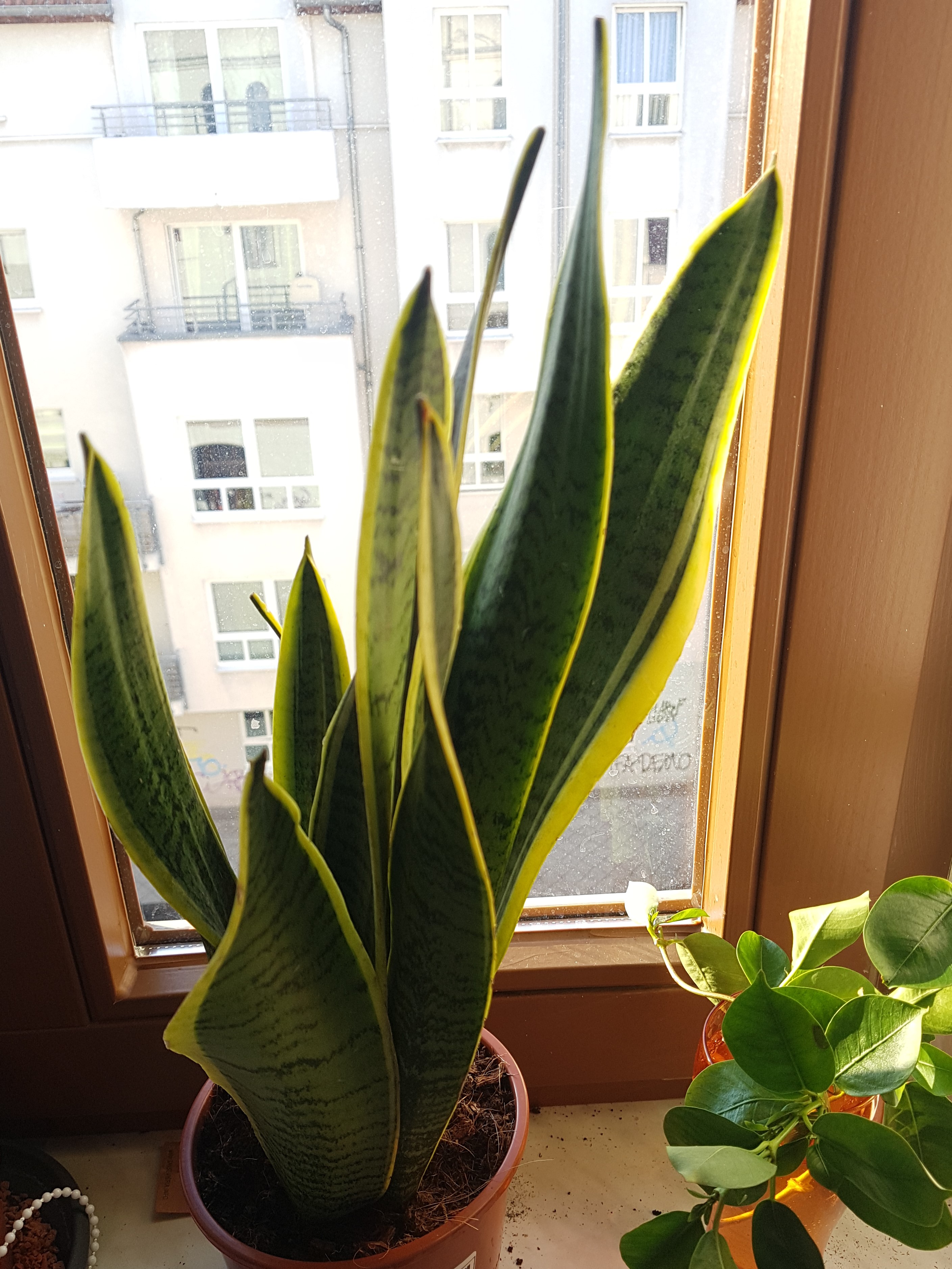 This is another plant that pretty much doubled in size. Snake plants are usually advertised as low-light plants, but let me tell you that this plant exploded once I got her used to our southern-facing balcony. She is very tolerant of low light, but if you haven’t seen any or only slow growth from your snake plant, try upping your light exposure. I water the pot thoroughly once every few weeks once the soil has dried throughout (that is very sparingly during winter), but during summer with the full southern sun exposure, I increased waterings up to once per week. My verdict in short: low-effort beginner plant – in long…