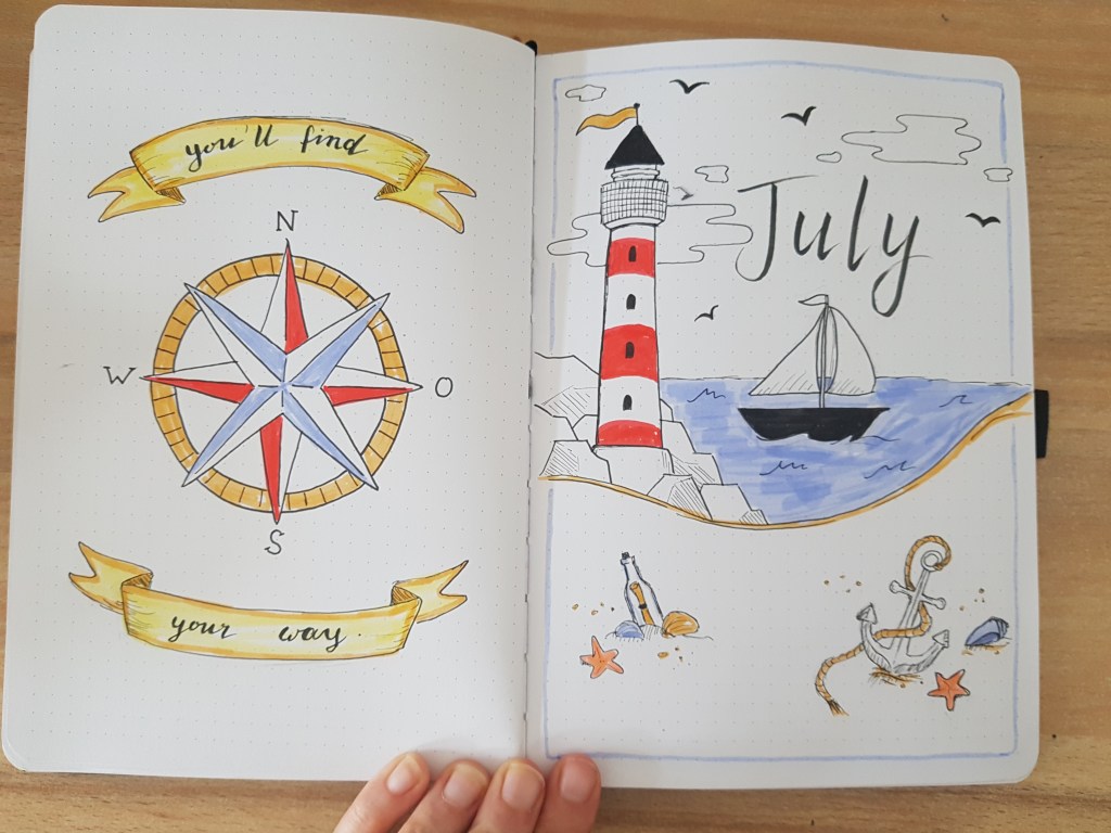 Once a month, I then setup for the coming month. For me that entails a cover page, the monthly calendar and the first weekly. The monthly cover page serves no real purpose and is thus entirely skippable – I, however, enjoy it as an artistic separator of the months and will do one unless I am not in the mood for drawing. These are some example cover pages that I really liked:
