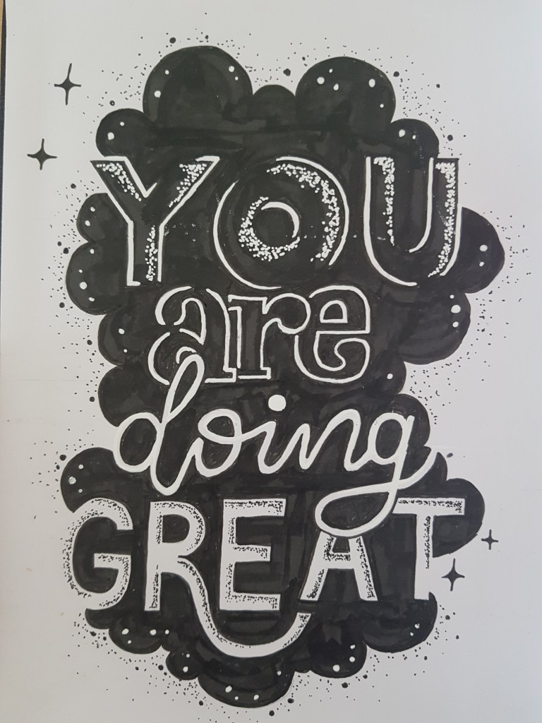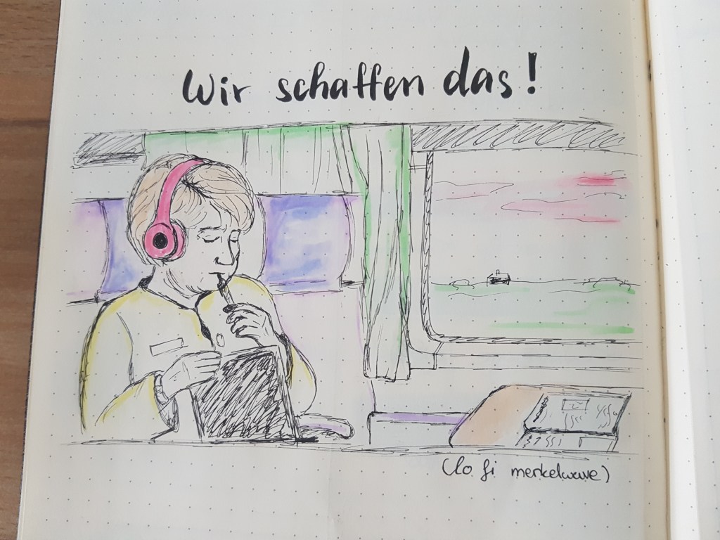 Lastly, my bullet journal has become a great outlet for my random spurts of artistic motivations. This will lead to me cute-ifying my weekly spreads and monthly pages, as we have seen so far, but also leads to just straight-up drawings and quote pages. Some of them are very niche and exclusively for me – such as this kinda weird-looking Angela Merkel, as seen in the lofi merkel video that went viral during the first Covid lockdown in 2020 in Germany.
