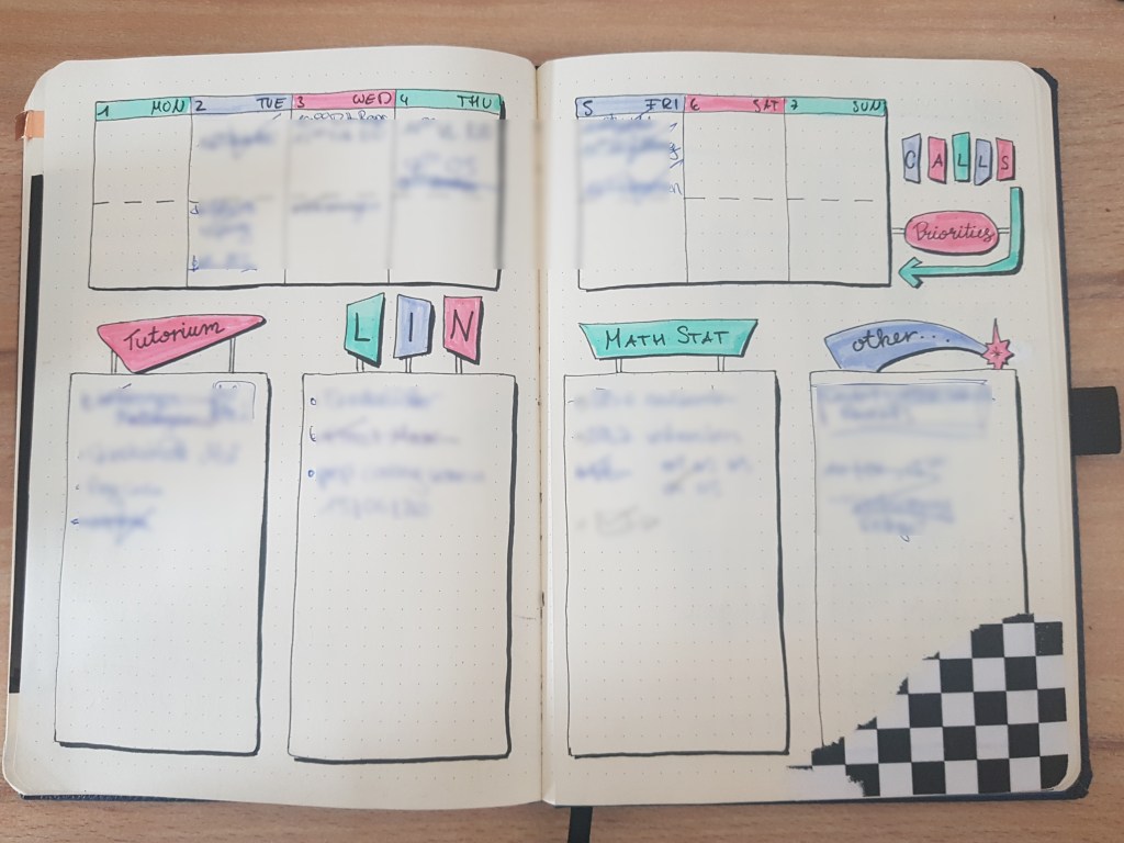 But you might still be wondering: why go through all the effort of writing and drawing your own planner instead of buying a ready-made journal. Let me explain what else I get out of it: except for the already-mentioned flexibility in the layout of my weeklies, monthlies and yearlies, one HUGE advantage for me is the possibility to add additional pages to my planner however I want. If I want to make a study tracker for the exam next month, I can easily flip to the next page and create it and then put the next weekly after it. Do I need more planning space this week? I can just give myself an entire page for each day. Whether I want to write down gift ideas for friends, spew all of my running thoughts and feelings onto a piece of paper or create spreads of my latest pop culture obsession, I just flip a page and start writing or drawing. It sounds trivial, but it has honestly been a game changer for me. Setting up the journal week by week, even day by day, allows for a flexibility which fits much better with the way my brain works and thinks of tasks and future events. And having all my random study trackers, appointments, to dos, journal entries and so on in one place means they are easy to refer back to, make sense of and remember later-on.