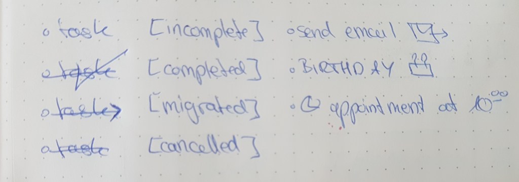 The actual magic of bullet journaling for me is how I write down and migrate my tasks from day-to-day and week-to-week. First of all, every day is a to do list – you can indicate what is what by the bullet you use, e.g. by representing tasks by dots, events by empty circles and notes by dashes. You can indicate a completed task by crossing out the bullet, and an uncompleted task that is migrated to the next day by an arrow. At least this is what the website recommends – I tried sticking to this system, but didn’t like it, because I enjoy crossing out entire tasks when they are done and kept mixing up dots, circles and dashes. I now write down tasks with whatever bullet I want (usually a circle) and take stock of them at the end each day: I cross them out with a big tick to indicate they are done. Tasks that are migrated are crossed out by a giant arrow and I immediately write them down for the next day. Tasks that are cancelled are just crossed out. Appointments get a clock symbol, emails get a letter and birthdays get a little cake. That’s it. The next day or week I can check which tasks are not yet crossed out and write them down again in today’s to do list. This goes on until they are done. This way no task can ever be forgotten or lost.