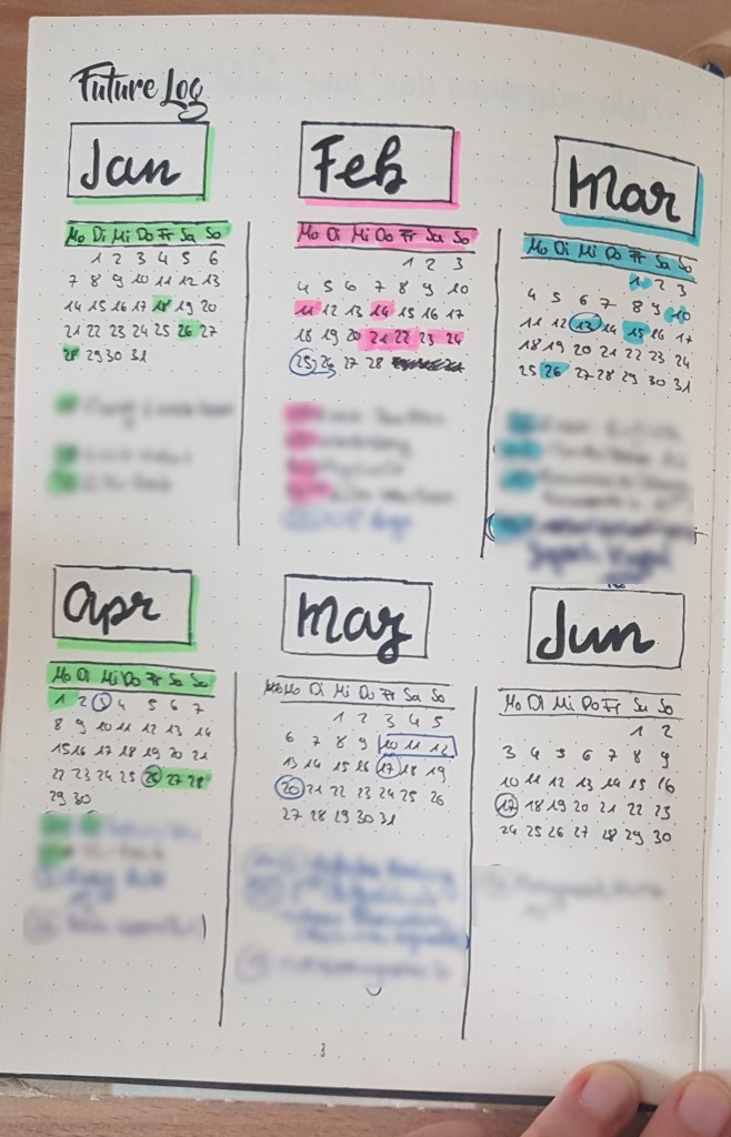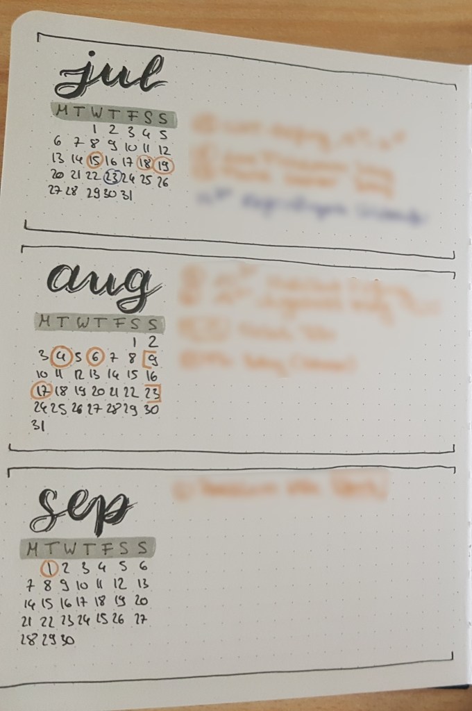 Every 6 months (which is about the time frame I can fit into one journal), I will first set up a monthly overview, where I can jot down any dates and appointments that are happening in the coming months that are not yet set up in detail. I have also started adding a “later” tab for dates more than 6 months from now, since in particular wedding invites and some holidays are often set very early in advance. A monthly overview might look like this: